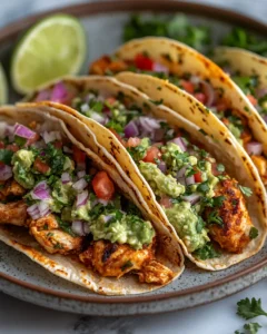 These tacos are already complete, but they also fit beautifully into a build-your-own taco bar. Place the chicken in a warm bowl, stack tortillas in a towel-lined basket, and set out guacamole and cheese in separate dishes. Add a simple bowl of shredded cabbage, diced tomatoes, and lime wedges so guests can customize. It’s casual, colorful, and designed for sharing—exactly what taco night should feel like.