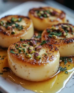 A creamy, crunchy, and lightly sweet appetizer that brings together herb-infused cheese, chopped pistachios, and warm hot honey for an irresistible flavor combination.