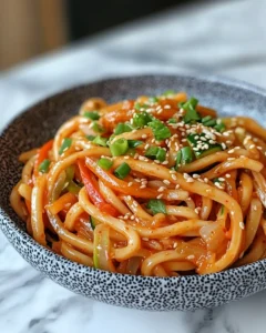 A warm, comforting bowl of udon noodles tossed in a rich and creamy gochujang sauce, loaded with fresh vegetables and optional protein. Perfect for cozy weeknight dinners or whenever you crave bold, spicy, and savory flavors in a satisfying noodle dish. Inspired by Korean flavors, this recipe combines creaminess, umami, and a touch of heat for a deliciously balanced meal.