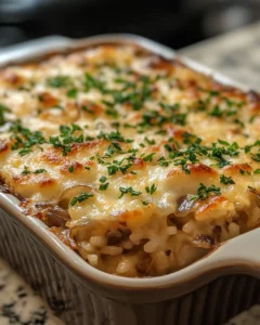 This recipe was inspired by classic French onion flavors reimagined into a practical family-style bake. Instead of standing over the stove stirring onions endlessly, everything comes together in a single casserole dish. It is the kind of meal that feels like comfort food at its best, perfect for busy weeknights, relaxed Sunday dinners, or even casual gatherings when you want something dependable that everyone will enjoy.