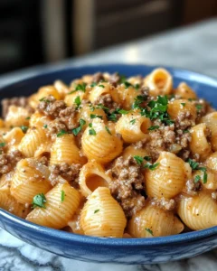 This recipe stands out because it is designed to deliver maximum flavor with minimal effort. Cooking everything in one pot allows the pasta to absorb the rich, savory broth and cream as it cooks, creating a sauce that clings beautifully to every shell. The beef adds depth and heartiness, while simple seasonings bring balance without overpowering the dish.