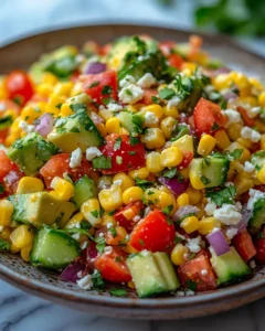 A vibrant summer salad featuring sweet corn, creamy avocado, crisp vegetables, and a refreshing lime dressing. Perfect as a light meal or a colorful side dish for warm weather gatherings.