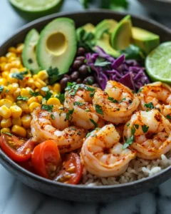 The inspiration for this dish comes from the idea of building meals that feel customizable and joyful. Grain bowls have long been a staple in many cultures, bringing together protein, vegetables, and seasoning in one comforting bowl. By pairing juicy shrimp with bright lime and gentle heat from chili spices, this recipe transforms simple ingredients into a crave-worthy meal. It is the kind of dish you can prepare once and enjoy all week, or proudly serve to guests as a wholesome, flavorful centerpiece.