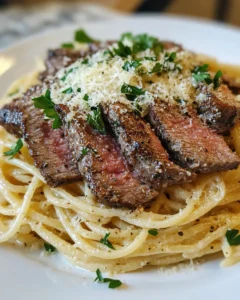 A rich and comforting pasta dish featuring tender steak slices tossed in a creamy garlic butter sauce with parmesan and perfectly cooked pasta.