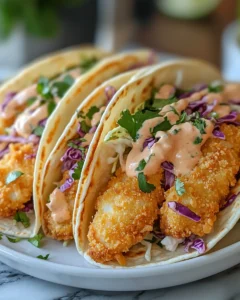 A satisfying taco recipe featuring golden crispy fish, fresh slaw, and a creamy tangy sauce, perfect for relaxed meals or special gatherings.