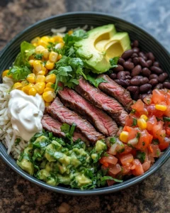 Assemble bowls by adding rice to the base, then top with sliced steak, beans, corn, fresh salsa, lettuce, avocado, cheese, and sour cream or yogurt. Serve with lime wedges.