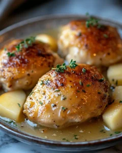 This dish brings together familiar flavors in a way that feels refined yet easy to prepare. Tender chicken is gently seared, then simmered in a velvety apple cider sauce infused with shallots, garlic, fresh thyme, and a touch of cream. The apples soften as they cook, adding subtle sweetness and texture that perfectly complements the savory chicken.