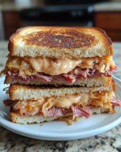 This recipe is inspired by classic deli-style sandwiches that balance richness with brightness. The contrast between buttery toasted bread, hearty seasoned beef, melty cheese, and tangy slaw creates a harmony that has stood the test of time. Over the years, I’ve refined this version to make it approachable for home kitchens while preserving that indulgent, diner-style experience that makes a Reuben unforgettable.