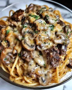 What makes this recipe stand out is its balance. The savory steak provides depth, the mushrooms add earthiness, and the onions contribute a gentle sweetness that ties everything together. The cream sauce, enhanced with garlic and parmesan, creates a luxurious texture that coats each strand of spaghetti beautifully.