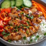 This vibrant bowl combines tender sweet chili chicken, fluffy rice, fresh vegetables, and a creamy coconut lime drizzle for a satisfying and crave-worthy meal.