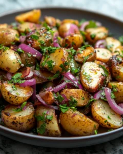 This potato salad stands out because it avoids heaviness. There is no thick dressing masking the ingredients. Instead, every component plays a role: tender potatoes absorb the seasoning, herbs add freshness, and sumac ties everything together with its signature zest.